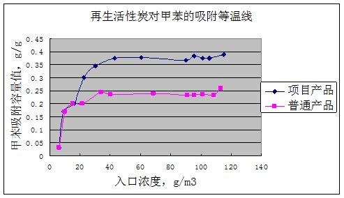 本產(chǎn)品主要是用特有工藝,促進(jìn)活化過程中所需孔隙的形成,使活性炭產(chǎn)品的孔徑分布均勻,提高產(chǎn)品對甲苯氣體的選擇性,使產(chǎn)品對甲苯吸附性能大幅度提高。通過對甲苯的吸附脫附試驗(yàn)以及客戶的實(shí)際使用情況得知,甲苯吸儲(chǔ)專用活性炭對甲苯吸附容量可達(dá)到450mg/g,再生吸附容量可達(dá)380mg/g。再生吸附率達(dá)到了84.4%。比普通活性炭有更佳的表現(xiàn),大大提高甲苯的回收率和使用壽命。